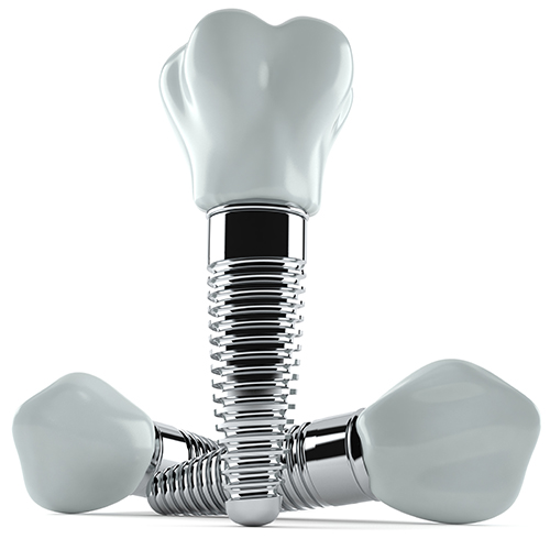 - Implants serve as a replacement tooth root. When the root of a tooth is missing, the jawbone will gradually start to lose bone mass and density – this happens with standard bridges and dentures. However, with dental implants, the titanium screw acts as a faux tooth root. The jawbone is coerced into thinking that the tooth root is still there, and begins to grow new tissue around it, keeping the jawbone from deteriorating.